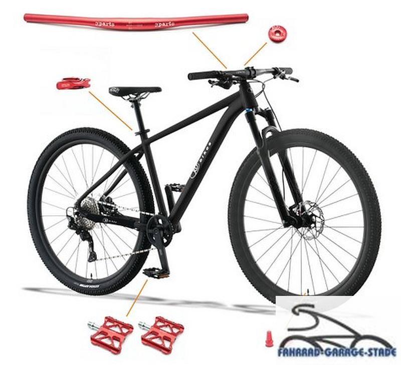 -Lenker, Pedale, Sattelstütze und Ventilkappen in laser red